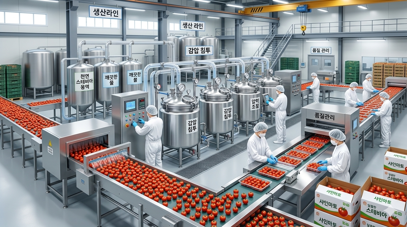 흔히 스테비아 비료를 주고 키운 농산물이라 생각하기 쉽지만, 사실은 수확 후의 공정이 핵심 입니다. 잘 익은 토마토를 천연 감미료인 스테비아 용액에 담근 뒤, 기압을 조절하는 **'감압 침투 공법'**을 통해 단맛을 껍질 안쪽까지 균일하게 배게 만듭니다.