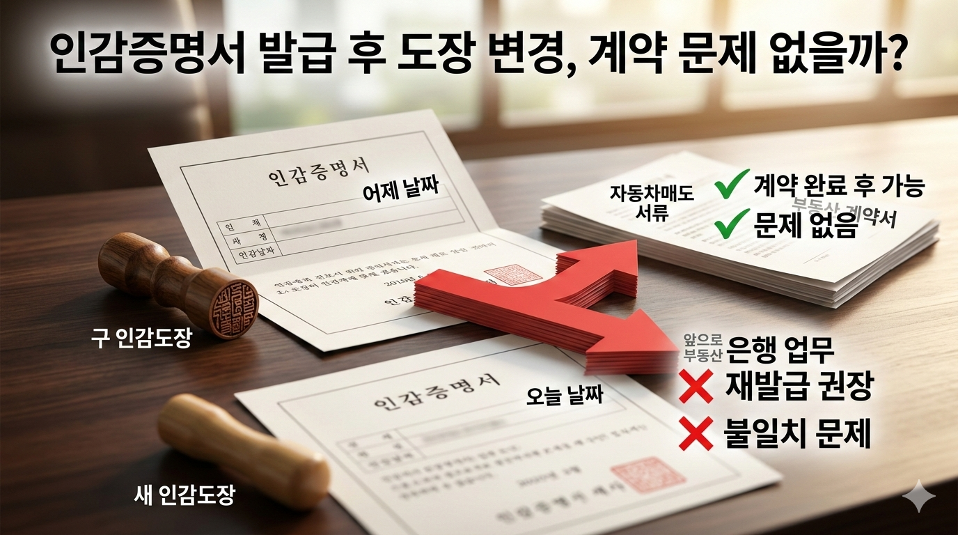 특히 "어제 인감증명서를 떼서 자동차를 팔았는데(혹은 계약했는데), 오늘 도장을 바꿔도 괜찮을까?" 하는 걱정이 드실 수 있습니다. 발행 후 며칠 뒤에 도장을 변경했을 때 발생할 수 있는 상황을 정리해 드립니다.