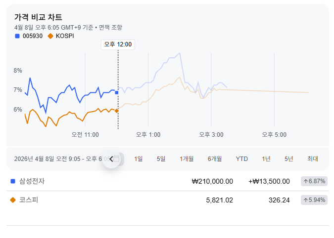 - 주가 현황: 실적 발표와 함께 삼성전자 주가는 전일 대비 7.12% 상승한 210,500원에 마감하며'20 만전자' 시대를 열었습니다.